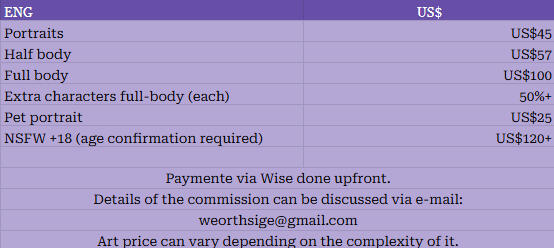 Read those terms before getting a commission or design from me. When you purchase anything from me, you're also accepting my Terms of Service/Terms of Usage.★ I will not accept your request if I don't feel comfortable with it.★ Payment is required upfront, you are expected to pay within 24 hours or your slot will not be secured and will be given to someone else.★ I will confirm the payment before starting your commission, I do not take proof of payment because I've been scammed several times before (you can thank them for that).★ I will need age confirmation for the case of suggestive and nsfw art.★ NO REFUNDS. All sales are final, therefore you must be a 100% sure you want to go on with it. Check my art style carefully, the sketches, finished pieces, everything.★ I will not take deviantArt points as payment or other oayment methods unless previously discussed (if I do, it's for a 5 dollar sketch tops). I do mostly Brazilian Reais through pix, USD and EUR through Wise.★ I DO NOT USE PAYPAL AND I DO NOT PLAN ON IT.★ I am open to a payment plan if the price of the commission is US$200 or more. An acceptable payment plan would be half upfront to secure your slot, and another half within a discussed time frame. Commissions under US$200 must be paid upfront.★ Turn-around-time depends on the type and complexity of commission you order and your position in the queue, your art may take more than 60 days once your turn arrives in the queue due to my chronic pain (I can't spend too much time in front of computer because it ruins my lower-back and shoulders for several days). Clients will be updated about potential delays.★ I send updates of the artwork to the client upon sketch completion and finishing stages (aka major updates). Custom design clients will be sent updates at the sketch, coloring, and finishing stages. Other updates will be sent at the clients request. Just don't be invasive and ask all the time about it.★ I will not refund you payment once I've already started your commission.★ You have up to 2 changes to be done in your commissions before I start coloring it, you'll be paying 50% the price of the commission to every extra change you want me to make.★ Commercial art will be charged extra for commercial use and you will have to sign a form.★ I do require at least a certain amount of reference so I can start your commission, otherwise it'll be nearly impossible for me to even start it and it will take way longer than expected to be finished. You can sketch your idea with stick figures, and we'll get into it.★ Price/time can and WILL vary according to complexity.★ Don't turn my art into NFT, I know my legal rights as an artist.Please be patient. I have ADHD & autism, communication isn't really my forte although I do my best to be as straightforward as I can!